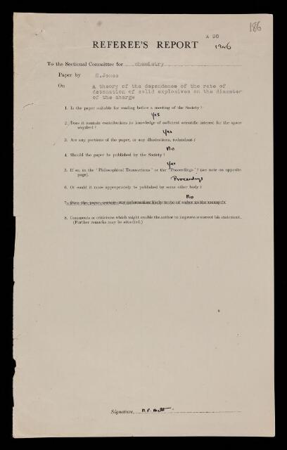 Nevill Francis Mott, Referee's report by Nevill Francis Mott, on a paper 'A theory of the dependence of the rate of detonation of solid explosives on the diameter of the charge' by Harry Jones, 1946, RR/69/186, The Royal Society Archives, London, https://makingscience.royalsociety.org/items/rr_69_186/referees-report-by-nevill-francis-mott-on-a-paper-a-theory-of-the-dependence-of-the-rate-of-detonation-of-solid-explosives-on-the-diameter-of-the-charge-by-harry-jones, accessed on 13 November 2025