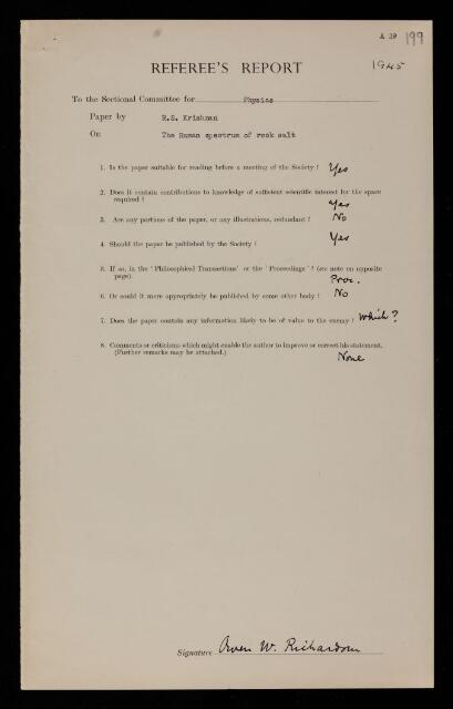 Owen Willans Richardson, Referee's report by Owen Willans Richardson, on a paper 'The Raman spectrum of rock-salt' by R S Krishnan, 1945, RR/69/199, The Royal Society Archives, London, https://makingscience.royalsociety.org/items/rr_69_199/referees-report-by-owen-willans-richardson-on-a-paper-the-raman-spectrum-of-rock-salt-by-r-s-krishnan, accessed on 07 December 2025
