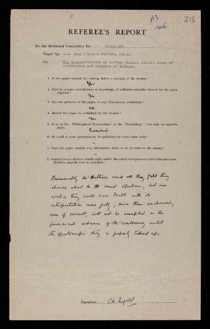 Christopher Kelk Ingold, Referee's report by Christopher Kelk Ingold, on a paper 'The thermochemistry of carbon: valence states, heats of sublimation and energies of linkage' by L H Long and Ronald George Wreyford Norrish, 1946, RR/69/213, The Royal Society Archives, London, https://makingscience.royalsociety.org/items/rr_69_213/referees-report-by-christopher-kelk-ingold-on-a-paper-the-thermochemistry-of-carbon-valence-states-heats-of-sublimation-and-energies-of-linkage-by-l-h-long-and-ronald-george-wreyford-norrish, accessed on 19 November 2025