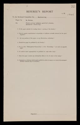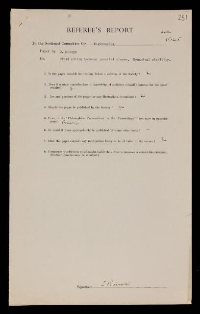 Leonard Bairstow, Referee's report by Leonard Bairstow, on a paper 'Fluid motion between parallel planes. Dynamical stability' by D Meksyn, 1945, RR/69/231, The Royal Society Archives, London, https://makingscience.royalsociety.org/items/rr_69_231/referees-report-by-leonard-bairstow-on-a-paper-fluid-motion-between-parallel-planes-dynamical-stability-by-d-meksyn, accessed on 06 December 2025