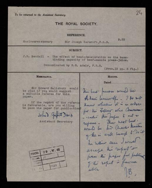 Memorandum from J D Griffith Davies, Assistant Secretary of the Royal Society, on a paper 'The effect of heat-denaturation on the base-binding capacity of beef-muscle press-juice' by J R Bendall to Joseph Barcroft