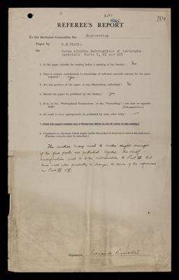 Referee's report by Leonard Bairstow, on a paper 'Large elastic deformations of isotropic materials. Parts I, II, and III' by R S Rivlin