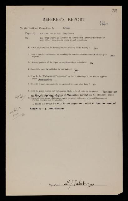 Referee's report by Edward James Salisbury, on a paper 'The differential effect of synthetic plant growth substances and other compounds upon plant species I. Seed germination and early growth responses to a-naphthylacetic acid and compounds of the general formula arylOCH2COOR' by W A Sexton and W G Templeman