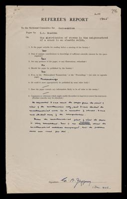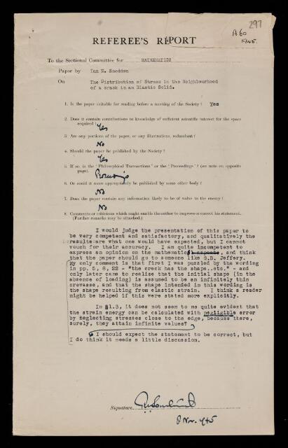 Richard Vynne Southwell, Referee's report by Richard Vynne Southwell, on a paper 'The distribution of stress in the neighbourhood of a crack in an elastic solid' by Ian Naismith Sneddon, 08 November 1945, RR/69/297, The Royal Society Archives, London, https://makingscience.royalsociety.org/items/rr_69_297/referees-report-by-richard-vynne-southwell-on-a-paper-the-distribution-of-stress-in-the-neighbourhood-of-a-crack-in-an-elastic-solid-by-ian-naismith-sneddon, accessed on 14 December 2025