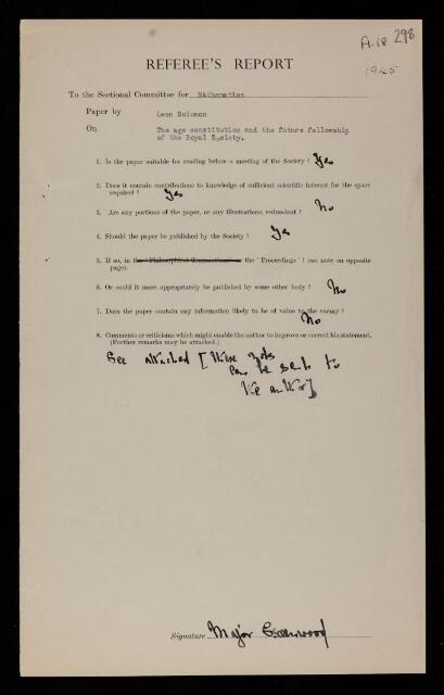Referee's report by Major Greenwood, on a paper 'The age constitution and the future fellowship of the Royal Society' by Leon Solomon
