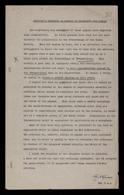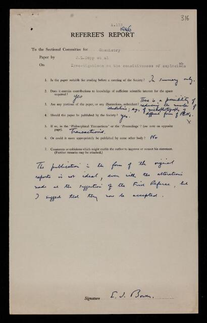 Edmund John Bowen, Referee's report by Edmund John Bowen, on a paper 'The sensitiveness of explosives - The onset of detonation in the sensitiveness of explosives' by Alfred Rene Jean Paul Ubbelohde, J L Copp, S E Napier, T Nash, W J Powell, H Skelly and P Woodward, 1946, RR/69/316, The Royal Society Archives, London, https://makingscience.royalsociety.org/items/rr_69_316/referees-report-by-edmund-john-bowen-on-a-paper-the-sensitiveness-of-explosives-the-onset-of-detonation-in-the-sensitiveness-of-explosives-by-alfred-rene-jean-paul-ubbelohde-j-l-copp-s-e-napier-t-nash-w-j-powell-h-skelly-and-p-woodward, accessed on 09 February 2026
