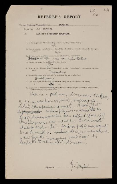 Geoffrey Ingram Taylor, Referee's report by Geoffrey Ingram Taylor, on a paper 'Kinetic boundary friction' by J R Bristow, 1945, RR/69/44, The Royal Society Archives, London, https://makingscience.royalsociety.org/items/rr_69_44/referees-report-by-geoffrey-ingram-taylor-on-a-paper-kinetic-boundary-friction-by-j-r-bristow, accessed on 11 March 2026
