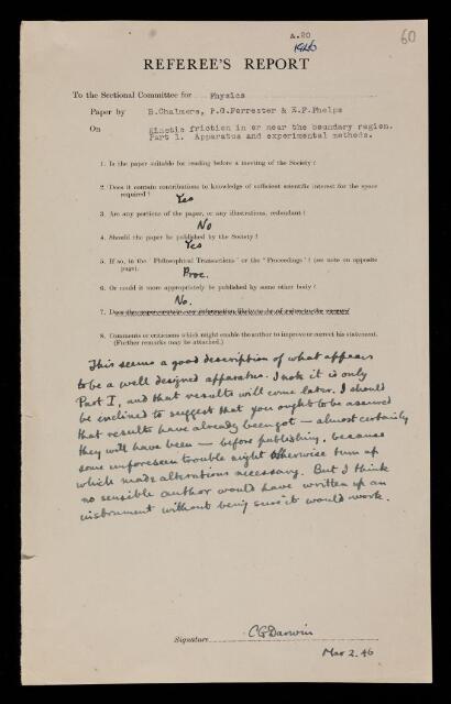 Charles Galton Darwin, Referee's report by Charles Galton Darwin, on a paper 'Kinetic friction in or near the boundary region - I. Apparatus and experimental methods' by Bruce Chalmers, P G Forrester and E F Phelps, 02 March 1946, RR/69/60, The Royal Society Archives, London, https://makingscience.royalsociety.org/items/rr_69_60/referees-report-by-charles-galton-darwin-on-a-paper-kinetic-friction-in-or-near-the-boundary-region-i-apparatus-and-experimental-methods-by-bruce-chalmers-p-g-forrester-and-e-f-phelps, accessed on 08 December 2025