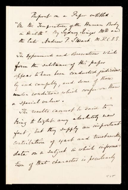 William Sharpey, Referee's report by William Sharpey, on a paper 'On the temperature of the human body in health' by Sydney Ringer and the late Andrew Patrick Stuart, 1869, RR/6/246, The Royal Society Archives, London, https://makingscience.royalsociety.org/items/rr_6_246/referees-report-by-william-sharpey-on-a-paper-on-the-temperature-of-the-human-body-in-health-by-sydney-ringer-and-the-late-andrew-patrick-stuart, accessed on 13 December 2025