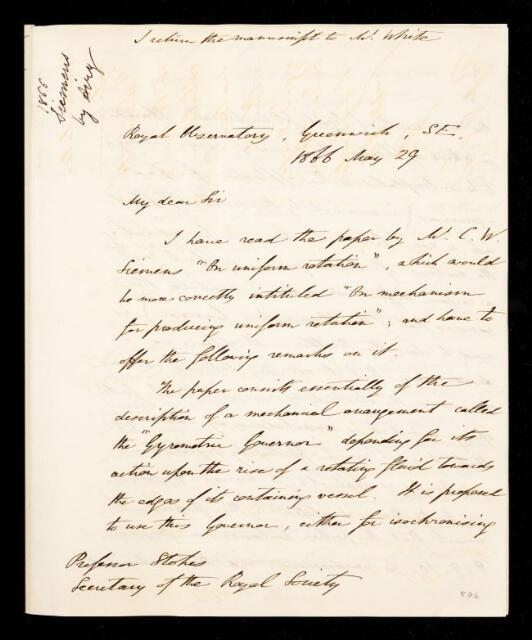 George Biddell Airy, Referee's report by George Biddell Airy, on a paper 'On uniform rotation' by Charles William Siemens, 29 May 1866, RR/6/272, The Royal Society Archives, London, https://makingscience.royalsociety.org/items/rr_6_272/referees-report-by-george-biddell-airy-on-a-paper-on-uniform-rotation-by-charles-william-siemens, accessed on 07 December 2025
