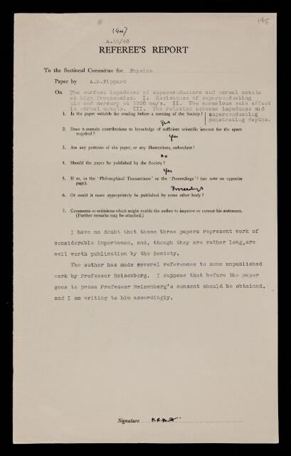 Nevill Francis Mott, Referee's report by Nevill Francis Mott, on three papers 'The surface impedance of superconductors and normal metals at high frequencies. Part I, II, and III' by A. B. Pippard, 1947, RR/70/195, The Royal Society Archives, London, https://makingscience.royalsociety.org/items/rr_70_195/referees-report-by-nevill-francis-mott-on-three-papers-the-surface-impedance-of-superconductors-and-normal-metals-at-high-frequencies-part-i-ii-and-iii-by-a-b-pippard, accessed on 14 November 2025
