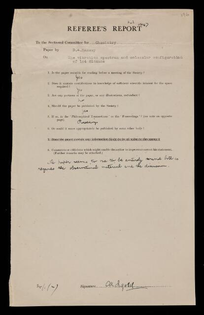 Christopher Kelk Ingold, Referee's report by Christopher Kelk Ingold, on a paper 'The vibration spectrum and molecular configuration of 1:4-dioxane' by Donald Allan Ramsay, 24 January 1947, RR/70/196, The Royal Society Archives, London, https://makingscience.royalsociety.org/items/rr_70_196/referees-report-by-christopher-kelk-ingold-on-a-paper-the-vibration-spectrum-and-molecular-configuration-of-14-dioxane-by-donald-allan-ramsay, accessed on 07 November 2025