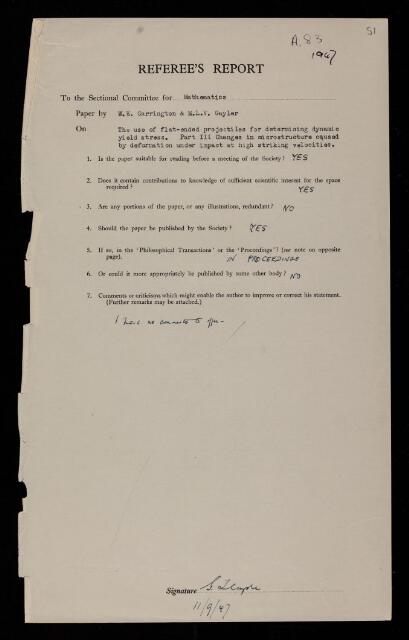 George Frederick James Temple, Referee's report by George Frederick James Temple, on a paper 'The use of flat-ended projectiles for determining dynamic yield stress III. Changes in microstructure caused by deformation under impact at high-striking velocities' by W E Carrington and Marie L V Gayler, 11 September 1947, RR/70/51, The Royal Society Archives, London, https://makingscience.royalsociety.org/items/rr_70_51/referees-report-by-george-frederick-james-temple-on-a-paper-the-use-of-flat-ended-projectiles-for-determining-dynamic-yield-stress-iii-changes-in-microstructure-caused-by-deformation-under-impact-at-high-striking-velocities-by-w-e-carrington-and-marie-l-v-gayler, accessed on 14 November 2025