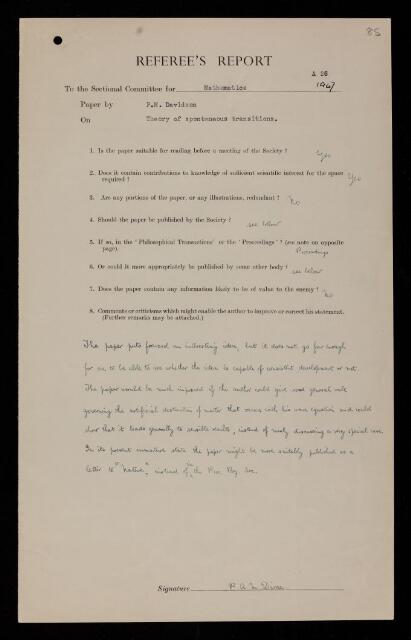 Paul Adrien Maurice Dirac, Referee's report by Paul Adrien Maurice Dirac, on a paper 'Theory of spontaneous transitions' by P M Davidson, 1947, RR/70/85, The Royal Society Archives, London, https://makingscience.royalsociety.org/items/rr_70_85/referees-report-by-paul-adrien-maurice-dirac-on-a-paper-theory-of-spontaneous-transitions-by-p-m-davidson, accessed on 11 February 2026