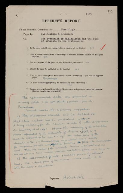 Robert Hill, Referee's report by Robert Hill, on a paper 'The formation of choleglobin and the role of catalase in the erythrocyte' by E C Foulkes and R Lemberg, 1948, RR/71/104, The Royal Society Archives, London, https://makingscience.royalsociety.org/items/rr_71_104/referees-report-by-robert-hill-on-a-paper-the-formation-of-choleglobin-and-the-role-of-catalase-in-the-erythrocyte-by-e-c-foulkes-and-r-lemberg, accessed on 14 November 2025