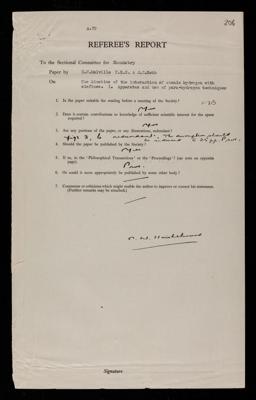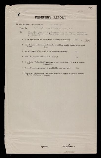 William Charles Evans, Referee's report by William Charles Evans, on a paper 'The kinetics of the interaction of atomic hydrogen with olefines I. Apparatus and use of para-hydrogen techniques' by Harry Work Melville and J C Robb, 1948, RR/71/205, The Royal Society Archives, London, https://makingscience.royalsociety.org/items/rr_71_205/referees-report-by-william-charles-evans-on-a-paper-the-kinetics-of-the-interaction-of-atomic-hydrogen-with-olefines-i-apparatus-and-use-of-para-hydrogen-techniques-by-harry-work-melville-and-j-c-robb, accessed on 14 December 2025