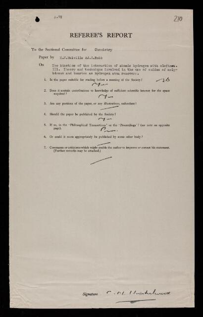 Cyril Norman Hinshelwood, Referee's report by Cyril Norman Hinshelwood, on a paper 'The kinetics of the interaction of atomic hydrogen with olefines III. Theory and technique involved in the use of the oxides of molybdenum and tungsten as hydrogen atom removers' by Harry Work Melville and J C Robb, 1948, RR/71/210, The Royal Society Archives, London, https://makingscience.royalsociety.org/items/rr_71_210/referees-report-by-cyril-norman-hinshelwood-on-a-paper-the-kinetics-of-the-interaction-of-atomic-hydrogen-with-olefines-iii-theory-and-technique-involved-in-the-use-of-the-oxides-of-molybdenum-and-tungsten-as-hydrogen-atom-removers-by-harry-work-melville-and-j-c-robb, accessed on 20 January 2026