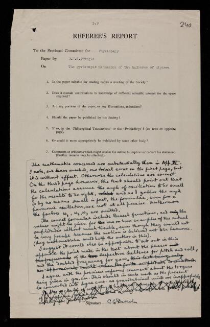 Charles Galton Darwin, Referee's report by Charles Galton Darwin, on a paper 'The gyroscopic mechanism of the halteres of Diptera' by John William Sutton Pringle, 1948, RR/71/240, The Royal Society Archives, London, https://makingscience.royalsociety.org/items/rr_71_240/referees-report-by-charles-galton-darwin-on-a-paper-the-gyroscopic-mechanism-of-the-halteres-of-diptera-by-john-william-sutton-pringle, accessed on 05 March 2026