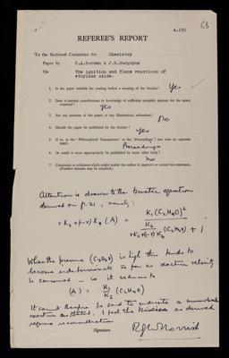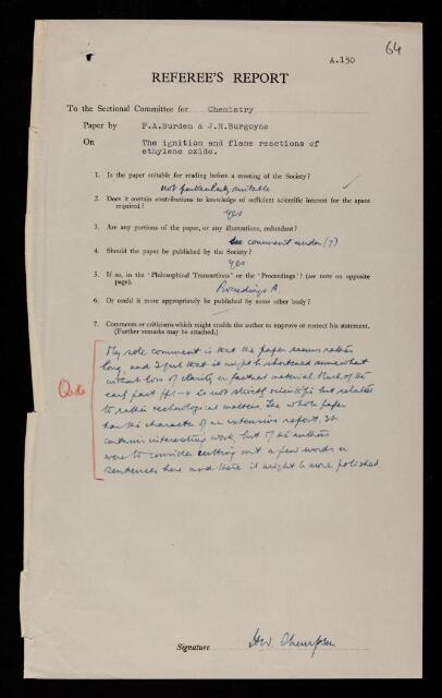 Harold Warris Thompson, Referee's report by Harold Warris Thompson, on a paper 'The ignition and flame reactions of ethylene oxide' by F A Burden and J H Burgoyne, 1948, RR/71/64, The Royal Society Archives, London, https://makingscience.royalsociety.org/items/rr_71_64/referees-report-by-harold-warris-thompson-on-a-paper-the-ignition-and-flame-reactions-of-ethylene-oxide-by-f-a-burden-and-j-h-burgoyne, accessed on 13 February 2026