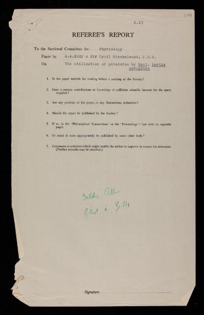 Referee's report by unknown author, on a paper 'The utilization of potassium by Bact. lactis aerogenes' by A A Eddy and Cyril Norman Hinshelwood, 1949, RR/72/104, The Royal Society Archives, London, https://makingscience.royalsociety.org/items/rr_72_104/referees-report-by-unknown-author-on-a-paper-the-utilization-of-potassium-by-bact-lactis-aerogenes-by-a-a-eddy-and-cyril-norman-hinshelwood, accessed on 17 March 2026