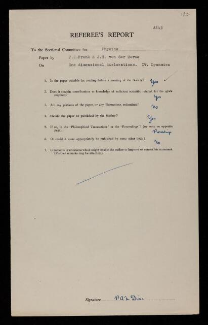 Paul Adrien Maurice Dirac, Referee's report by Paul Adrien Maurice Dirac, on a paper 'One-dimensional dislocations IV. Dynamics' by Frederick Charles Frank and J H van der Merwe, 1949, RR/72/122, The Royal Society Archives, London, https://makingscience.royalsociety.org/items/rr_72_122/referees-report-by-paul-adrien-maurice-dirac-on-a-paper-one-dimensional-dislocations-iv-dynamics-by-frederick-charles-frank-and-j-h-van-der-merwe, accessed on 09 December 2025
