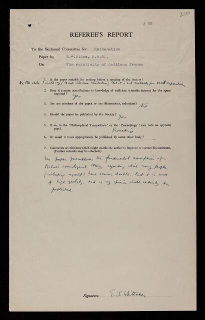 Edmund Taylor Whittaker, Referee's report by Edmund Taylor Whittaker, on a paper 'The relativity of Galilean frames' by Edward Arthur Milne, 1949, RR/72/200, The Royal Society Archives, London, https://makingscience.royalsociety.org/items/rr_72_200/referees-report-by-edmund-taylor-whittaker-on-a-paper-the-relativity-of-galilean-frames-by-edward-arthur-milne, accessed on 11 November 2025