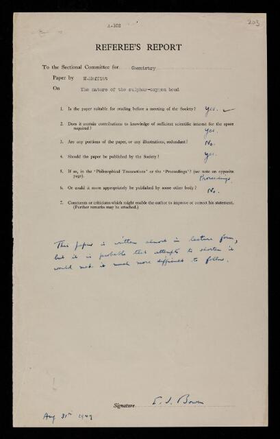 Edmund John Bowen, Referee's report by Edmund John Bowen, on a paper 'The nature of the sulphur-oxygen bond' by W Moffitt, 31 August 1949, RR/72/203, The Royal Society Archives, London, https://makingscience.royalsociety.org/items/rr_72_203/referees-report-by-edmund-john-bowen-on-a-paper-the-nature-of-the-sulphur-oxygen-bond-by-w-moffitt, accessed on 22 January 2026