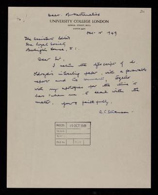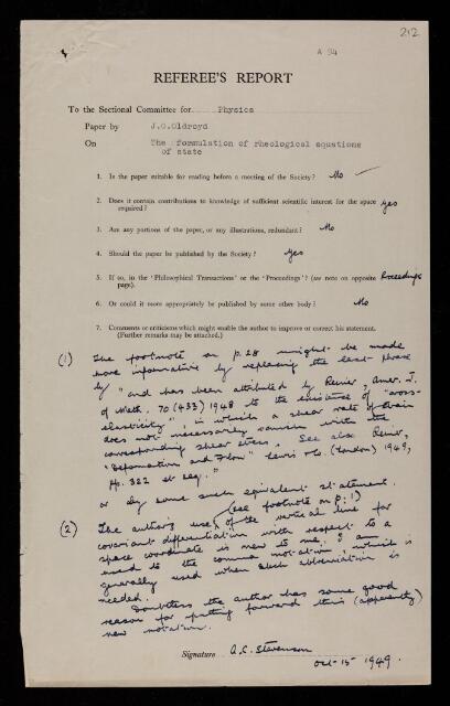 Referee's report by A C Stevenson, on a paper 'On the formulation of rheological equations of state' by J G Oldroyd, 15 October 1949, RR/72/212, The Royal Society Archives, London, https://makingscience.royalsociety.org/items/rr_72_212/referees-report-by-a-c-stevenson-on-a-paper-on-the-formulation-of-rheological-equations-of-state-by-j-g-oldroyd, accessed on 05 December 2025