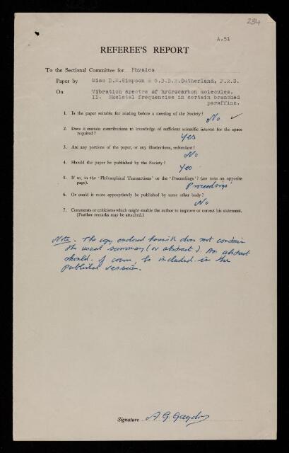 Alfred Gordon Gaydon, Referee's report by Alfred Gordon Gaydon, on a paper 'Vibration spectra of hydrocarbon molecules - II. Skeletal frequencies in certain branched paraffins' by Delia M Simpson and Gordon Brims Black Mcivor Sutherland, 1949, RR/72/234, The Royal Society Archives, London, https://makingscience.royalsociety.org/items/rr_72_234/referees-report-by-alfred-gordon-gaydon-on-a-paper-vibration-spectra-of-hydrocarbon-molecules-ii-skeletal-frequencies-in-certain-branched-paraffins-by-delia-m-simpson-and-gordon-brims-black-mcivor-sutherland, accessed on 08 November 2025