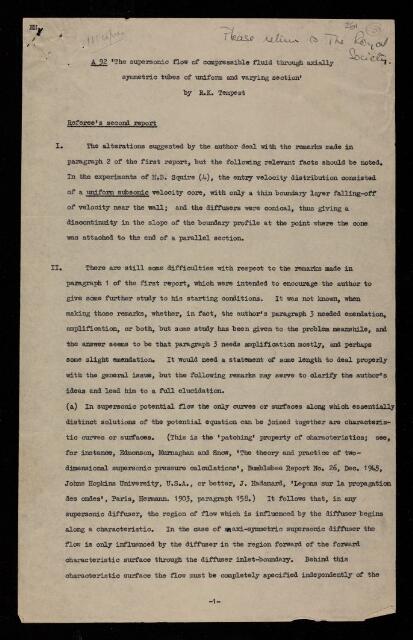 Report by [unknown referee], on a paper 'The supersonic flow of compressible fluid through axially symmetric tubes of uniform and varying section' by R K Tempest, 1949, RR/72/261, The Royal Society Archives, London, https://makingscience.royalsociety.org/items/rr_72_261/report-by-unknown-referee-on-a-paper-the-supersonic-flow-of-compressible-fluid-through-axially-symmetric-tubes-of-uniform-and-varying-section-by-r-k-tempest, accessed on 11 March 2026