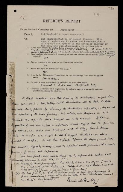 Percival Hartley, Referee's report by Percival Hartley, on a paper 'The transplantation of normal tissues: with special reference to auto- and homotransplants of thyroid and spleen in the anterior chamber of the eye, and subcutaneously, in guinea-pigs' by Michael Francis Addison Woodruff and Hazel G Woodruff, 1949, RR/72/276, The Royal Society Archives, London, https://makingscience.royalsociety.org/items/rr_72_276/referees-report-by-percival-hartley-on-a-paper-the-transplantation-of-normal-tissues-with-special-reference-to-auto-and-homotransplants-of-thyroid-and-spleen-in-the-anterior-chamber-of-the-eye-and-subcutaneously-in-guinea-pigs-by-michael-francis-addison-woodruff-and-hazel-g-woodruff, accessed on 20 January 2026