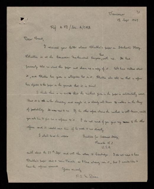 Letter from Paul Adrien Maurice Dirac, on a paper 'On the stochastic theory of continuous parametric systems and its application to electron cascades' by Homi Jehangir Bhabha to David Brunt, 12 September 1949, RR/72/31, The Royal Society Archives, London, https://makingscience.royalsociety.org/items/rr_72_31/letter-from-paul-adrien-maurice-dirac-on-a-paper-on-the-stochastic-theory-of-continuous-parametric-systems-and-its-application-to-electron-cascades-by-homi-jehangir-bhabha-to-david-brunt, accessed on 12 December 2025