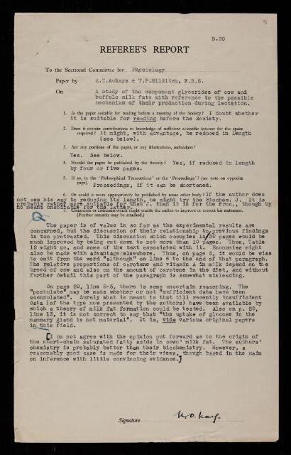 Herbert Davenport Kay, Referee's report by Herbert Davenport Kay, on a paper 'A study of the component glycerides of cow and buffalo milk fats with reference to the possible mechanism of their production during lactation' by K T Achaya and Thomas Percy Hilditch, 1949, RR/72/5, The Royal Society Archives, London, https://makingscience.royalsociety.org/items/rr_72_5/referees-report-by-herbert-davenport-kay-on-a-paper-a-study-of-the-component-glycerides-of-cow-and-buffalo-milk-fats-with-reference-to-the-possible-mechanism-of-their-production-during-lactation-by-k-t-achaya-and-thomas-percy-hilditch, accessed on 17 January 2026
