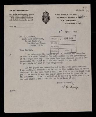 Letter from William George Penney, on a paper 'The effect of diffusion of the main reactants on flame speeds in gases' by J Corner to D C Martin, Assistant Secretary of the Royal Society