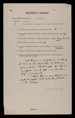 Alfred Charles Glyn Egerton, Referee's report by Alfred Charles Glyn Egerton, on a paper 'The effect of diffusion of the main reactants on flame speeds in gases' by J Corner, 1949, RR/72/74, The Royal Society Archives, London, https://makingscience.royalsociety.org/items/rr_72_74/referees-report-by-alfred-charles-glyn-egerton-on-a-paper-the-effect-of-diffusion-of-the-main-reactants-on-flame-speeds-in-gases-by-j-corner, accessed on 17 March 2026