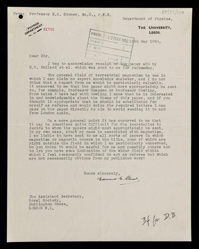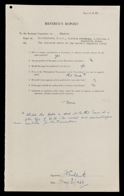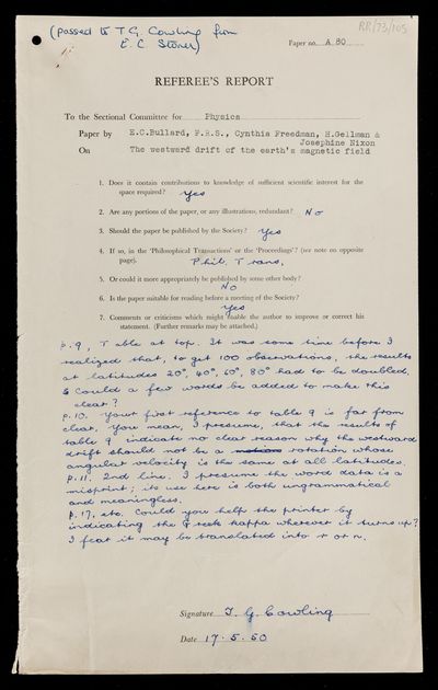 Willie Sucksmith, Referee's report by Willie Sucksmith, on a paper 'The westward drift of the Earth's magnetic field' by Edward Crisp Bullard, Cynthia Freedman, H Gellman and Jo Nixon, 31 May 1950, RR/73/106, The Royal Society Archives, London, https://makingscience.royalsociety.org/items/rr_73_106/referees-report-by-willie-sucksmith-on-a-paper-the-westward-drift-of-the-earths-magnetic-field-by-edward-crisp-bullard-cynthia-freedman-h-gellman-and-jo-nixon, accessed on 12 March 2026
