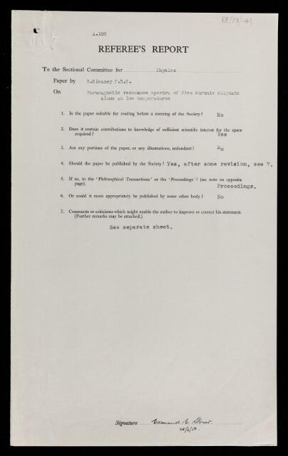 Edmund Clifton Stoner, Referee's report by Edmund Clifton Stoner, on a paper 'Paramagnetic resonance spectra of five chromic sulphate alums at low temperatures' by Brebis Bleaney, 28 June 1950, RR/73/143, The Royal Society Archives, London, https://makingscience.royalsociety.org/items/rr_73_143/referees-report-by-edmund-clifton-stoner-on-a-paper-paramagnetic-resonance-spectra-of-five-chromic-sulphate-alums-at-low-temperatures-by-brebis-bleaney, accessed on 25 January 2026