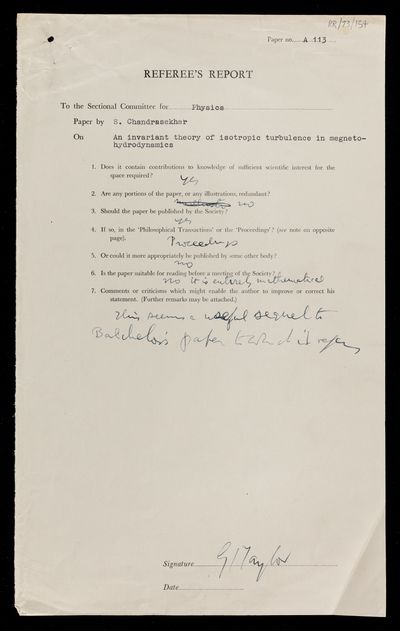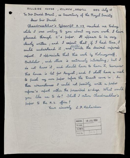 Letter from Lewis Fry Richardson, on a paper 'An invariant theory of isotropic turbulence in magneto-hydrodynamics' by Sivaramakrishna Chandrasekhar, to David Brunt, Secretary of the Royal Society, 15 July 1950, RR/73/153, The Royal Society Archives, London, https://makingscience.royalsociety.org/items/rr_73_153/letter-from-lewis-fry-richardson-on-a-paper-an-invariant-theory-of-isotropic-turbulence-in-magneto-hydrodynamics-by-sivaramakrishna-chandrasekhar-to-david-brunt-secretary-of-the-royal-society, accessed on 14 January 2026
