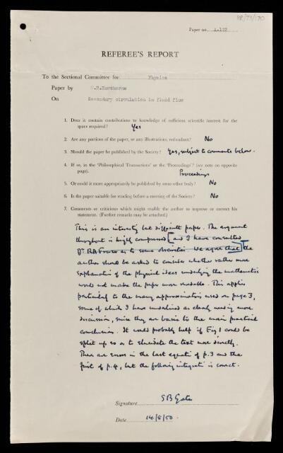 Sidney Barrington Gates, Referee's report by Sidney Barrington Gates, on a paper 'On secondary circulation in fluid flow' by William Rede Hawthorne, 14 August 1950, RR/73/170, The Royal Society Archives, London, https://makingscience.royalsociety.org/items/rr_73_170/referees-report-by-sidney-barrington-gates-on-a-paper-on-secondary-circulation-in-fluid-flow-by-william-rede-hawthorne, accessed on 11 February 2026