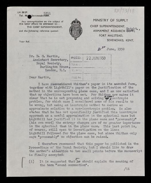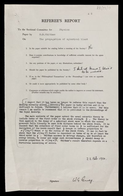 William George Penney, Letter from William George Penney, on a paper 'The propagation of spherical blast' by Gerald Beresford Whitham, to D C Martin, Assistant Secretary of the Royal Society, 21 June 1950, RR/73/18, The Royal Society Archives, London, https://makingscience.royalsociety.org/items/rr_73_18/letter-from-william-george-penney-on-a-paper-the-propagation-of-spherical-blast-by-gerald-beresford-whitham-to-d-c-martin-assistant-secretary-of-the-royal-society, accessed on 20 January 2026