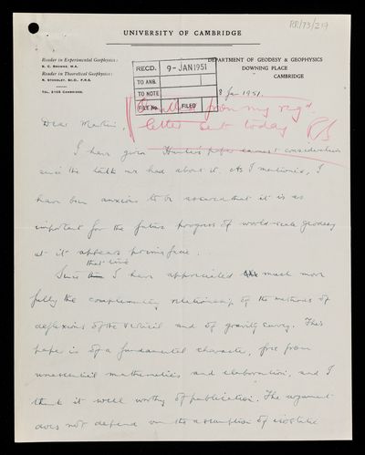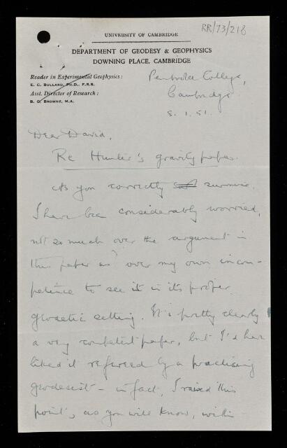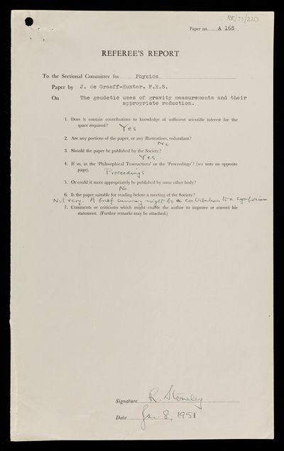 Robert Stoneley, Letter from Robert Stoneley, on a paper 'The geodetic uses of gravity measurements and appropriate reduction' by James de Graff Hunter, to David [Brunt, Secretary of the Royal Society], 08 January 1951, RR/73/218, The Royal Society Archives, London, https://makingscience.royalsociety.org/items/rr_73_218/letter-from-robert-stoneley-on-a-paper-the-geodetic-uses-of-gravity-measurements-and-appropriate-reduction-by-james-de-graff-hunter-to-david-brunt-secretary-of-the-royal-society, accessed on 18 February 2026