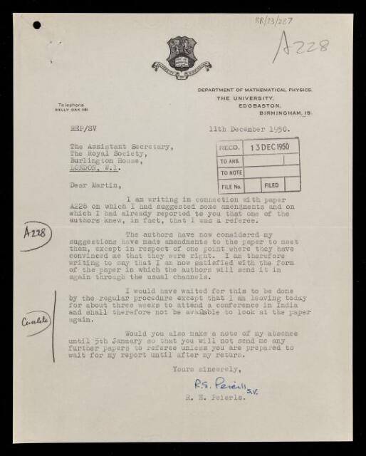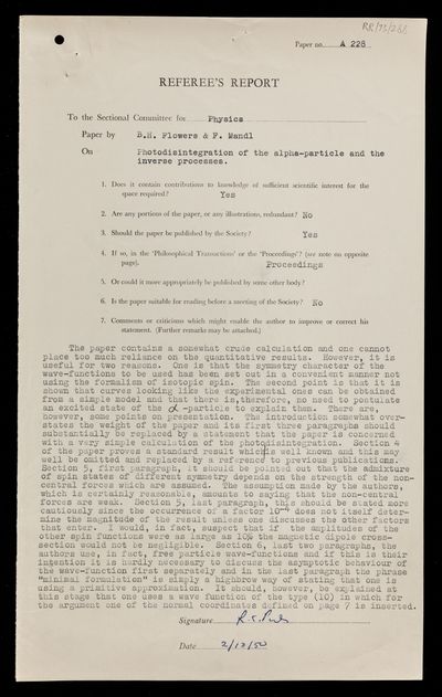 Rudolf Ernst Peierls, Letter from Rudolf Ernst Peierls, on a paper 'Photodisintegration of the alpha-particle and the inverse processes' by Brian Hilton Flowers and F Mandl, to D C Martin, Assistant Secretary of the Royal Society, 11 December 1950, RR/73/287, The Royal Society Archives, London, https://makingscience.royalsociety.org/items/rr_73_287/letter-from-rudolf-ernst-peierls-on-a-paper-photodisintegration-of-the-alpha-particle-and-the-inverse-processes-by-brian-hilton-flowers-and-f-mandl-to-d-c-martin-assistant-secretary-of-the-royal-society, accessed on 09 February 2026