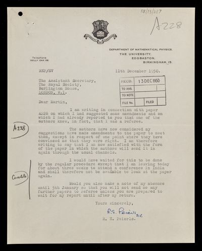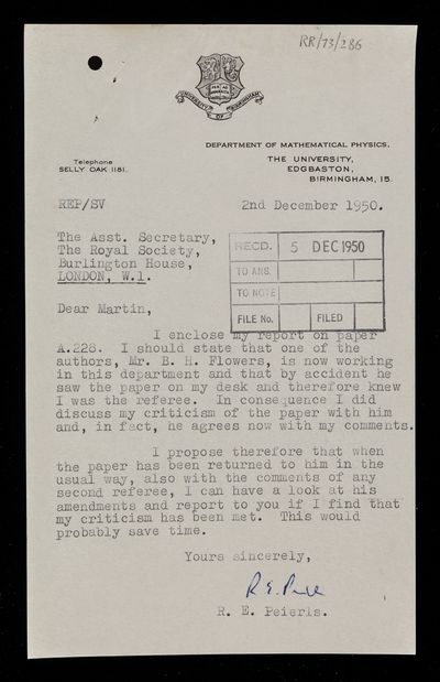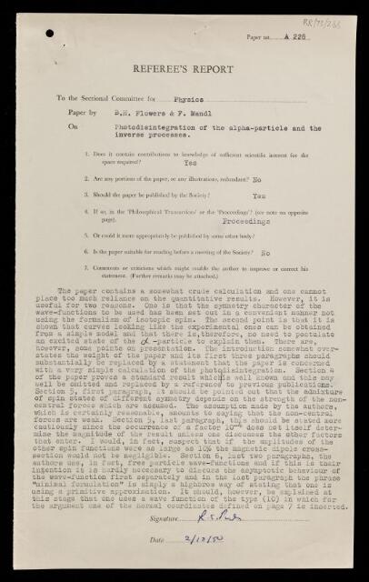 Rudolf Ernst Peierls, Referee's report by Rudolf Ernst Peierls, on a paper 'Photodisintegration of the alpha-particle and the inverse processes' by Brian Hilton Flowers and F Mandl, 02 December 1950, RR/73/288, The Royal Society Archives, London, https://makingscience.royalsociety.org/items/rr_73_288/referees-report-by-rudolf-ernst-peierls-on-a-paper-photodisintegration-of-the-alpha-particle-and-the-inverse-processes-by-brian-hilton-flowers-and-f-mandl, accessed on 15 November 2025