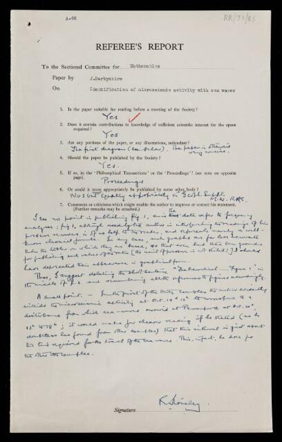 Robert Stoneley, Referee's report by Robert Stoneley, on a paper 'Identification of microseismic activity with sea waves' by J Darbyshire, 1950, RR/73/63, The Royal Society Archives, London, https://makingscience.royalsociety.org/items/rr_73_63/referees-report-by-robert-stoneley-on-a-paper-identification-of-microseismic-activity-with-sea-waves-by-j-darbyshire, accessed on 12 December 2025