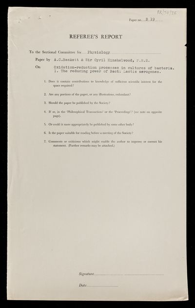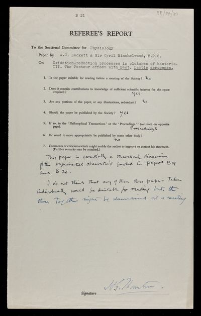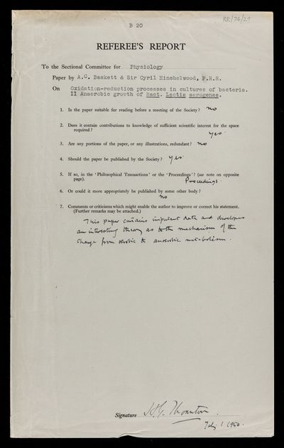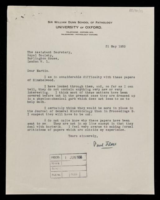 Paul Gordon Fildes, Letter from Paul Gordon Fildes, on three papers 'Oxidation-reduction processes in cultures of bacteria Parts I, II and III' by A C Baskett and Cyril Hinshelwood, to D C Martin, Assistant Secretary of the Royal Society, 31 May 1950, RR/74/25, The Royal Society Archives, London, https://makingscience.royalsociety.org/items/rr_74_25/letter-from-paul-gordon-fildes-on-three-papers-oxidation-reduction-processes-in-cultures-of-bacteria-parts-i-ii-and-iii-by-a-c-baskett-and-cyril-hinshelwood-to-d-c-martin-assistant-secretary-of-the-royal-society, accessed on 04 December 2025