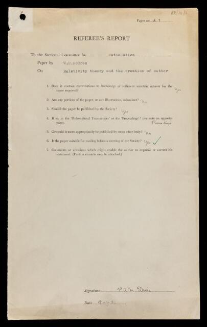 Paul Adrien Maurice Dirac, Referee's report by Paul Adrien Maurice Dirac, on a paper 'Relativity theory and the creation of matter' by William Hunter McCrea, 18 January 1951, RR/75/1, The Royal Society Archives, London, https://makingscience.royalsociety.org/items/rr_75_1/referees-report-by-paul-adrien-maurice-dirac-on-a-paper-relativity-theory-and-the-creation-of-matter-by-william-hunter-mccrea, accessed on 16 January 2026