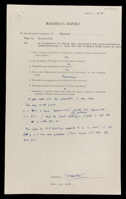 Douglas Rayner Hartree, Referee's report by Douglas Rayner Hartree, on a paper 'A comparison of theory and experiment for photoionization cross-sections I Neon and the elements from Boron to neon' by Michael John Seaton, 12 April 1951, RR/75/102, The Royal Society Archives, London, https://makingscience.royalsociety.org/items/rr_75_102/referees-report-by-douglas-rayner-hartree-on-a-paper-a-comparison-of-theory-and-experiment-for-photoionization-cross-sections-i-neon-and-the-elements-from-boron-to-neon-by-michael-john-seaton, accessed on 10 December 2025