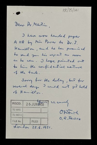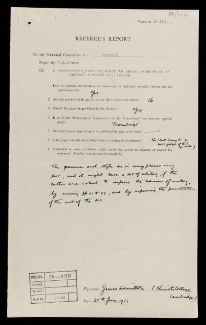 David James Hamilton, Referee's report by James Hamilton, on a paper 'A phenomenological approach to meson production in nucleon-nucleon collisions' by E A Power, 25 June 1951, RR/75/142, The Royal Society Archives, London, https://makingscience.royalsociety.org/items/rr_75_142/referees-report-by-james-hamilton-on-a-paper-a-phenomenological-approach-to-meson-production-in-nucleon-nucleon-collisions-by-e-a-power, accessed on 14 November 2025