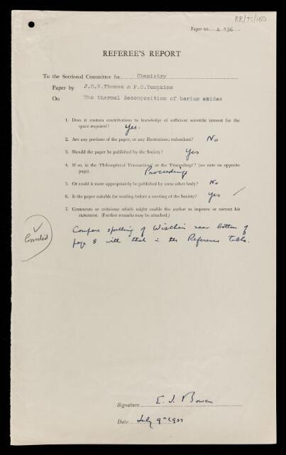 Edmund John Bowen, Referee's report by Edmund John Bowen, on a paper 'The thermal decomposition of barium azide' by J C N Thomas and Frederick Clifford Tompkins, 09 July 1951, RR/75/160, The Royal Society Archives, London, https://makingscience.royalsociety.org/items/rr_75_160/referees-report-by-edmund-john-bowen-on-a-paper-the-thermal-decomposition-of-barium-azide-by-j-c-n-thomas-and-frederick-clifford-tompkins, accessed on 09 March 2026