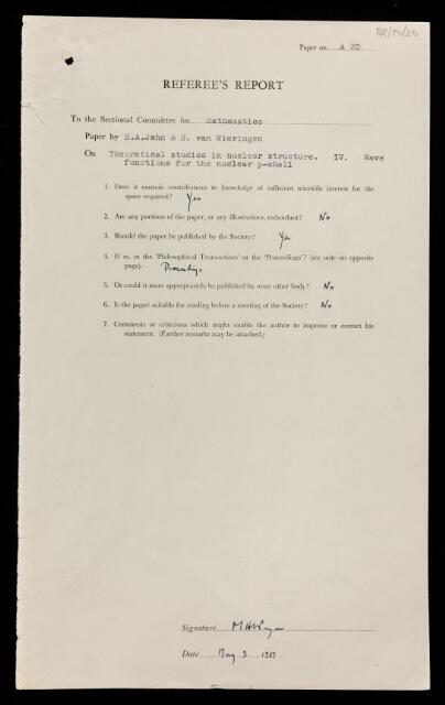 Maurice Henry Lecorney Pryce, Referee's report by Maurice Henry Lecorney Pryce, on a paper 'Theoretical studies in nuclear structure IV Wave functions for the nuclear p-shell' by H A Jahn and H van Wieringen, 03 May 1951, RR/75/25, The Royal Society Archives, London, https://makingscience.royalsociety.org/items/rr_75_25/referees-report-by-maurice-henry-lecorney-pryce-on-a-paper-theoretical-studies-in-nuclear-structure-iv-wave-functions-for-the-nuclear-p-shell-by-h-a-jahn-and-h-van-wieringen, accessed on 25 January 2026